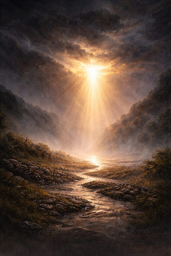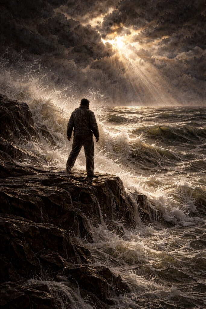 La tempesta non è finita, ma la luce ora domina la scena. Un raggio dorato attraversa il cielo e illumina il mare, che si fa più calmo. L’uomo resta in piedi. Non è vittoria spettacolare, ma forza stabile. La frattura non distrugge: trasforma.