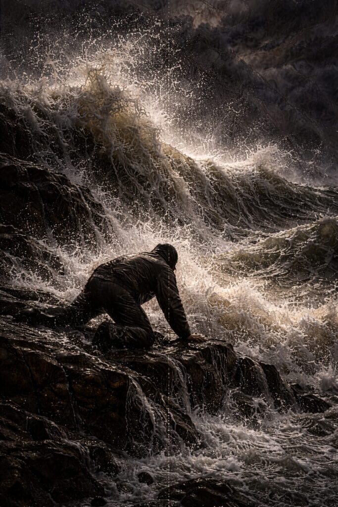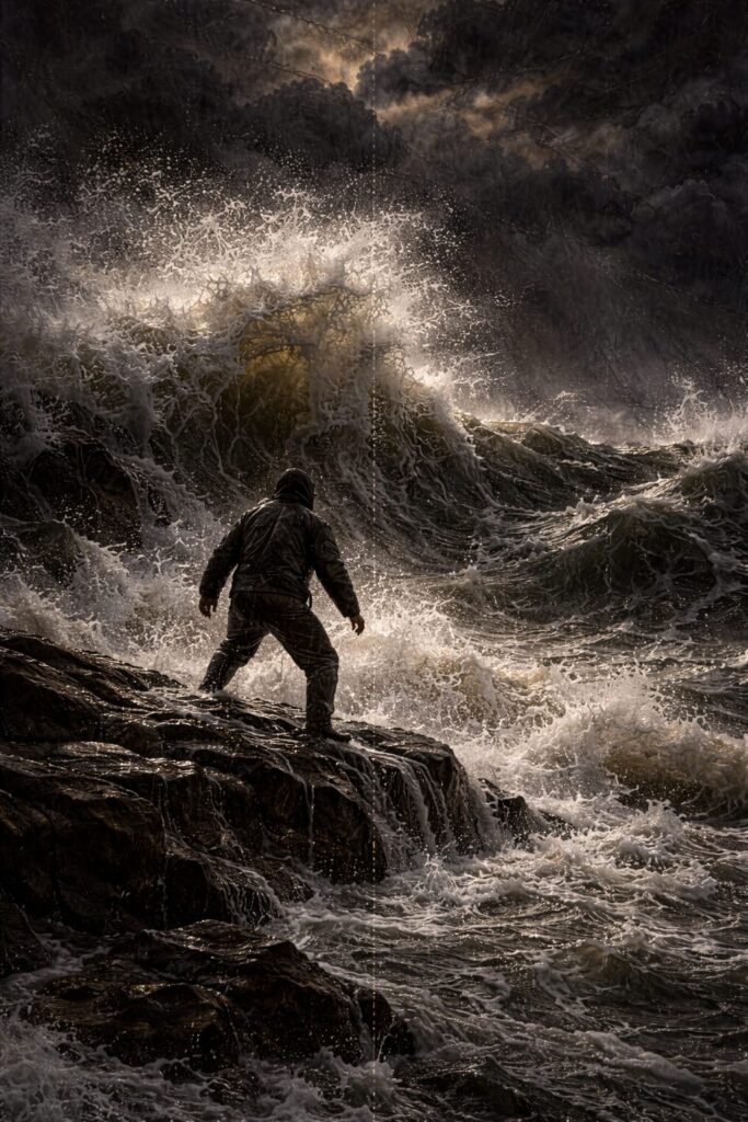 Un uomo solitario osserva il mare in tempesta da una scogliera. È piccolo rispetto alla vastità del paesaggio. Il cielo è pesante, le onde si alzano violente. Qui nasce la frattura: il momento in cui la vita cambia e l’isolamento diventa evidente. La luce è distante, filtrata tra le nuvole.