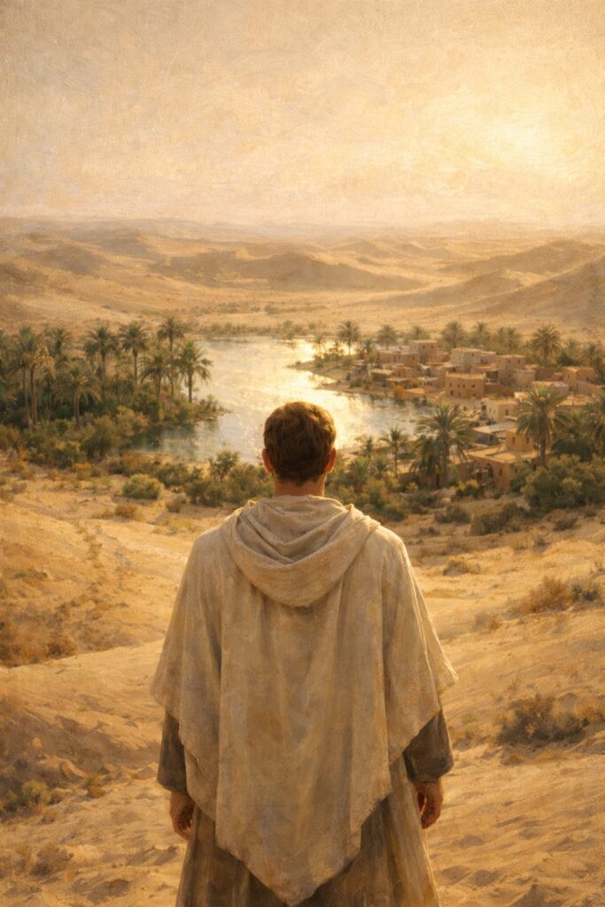Nel terzo atto la figura è di spalle e osserva l’oasi luminosa. Il deserto resta alle sue spalle, simbolo del cammino compiuto. La luce è più uniforme e meno drammatica. I colori tornano caldi ma più chiari rispetto al primo atto: non è più smarrimento, ma presenza consapevole.