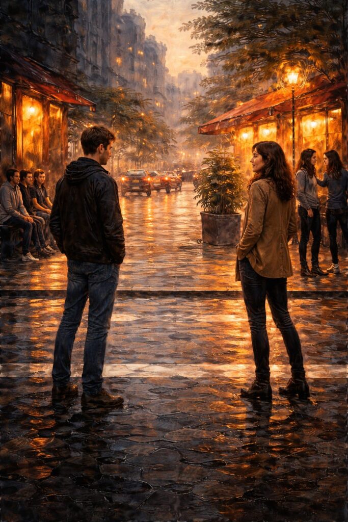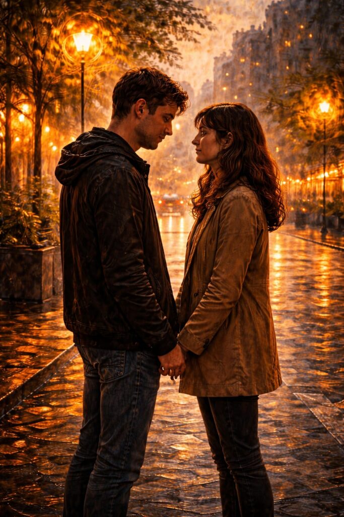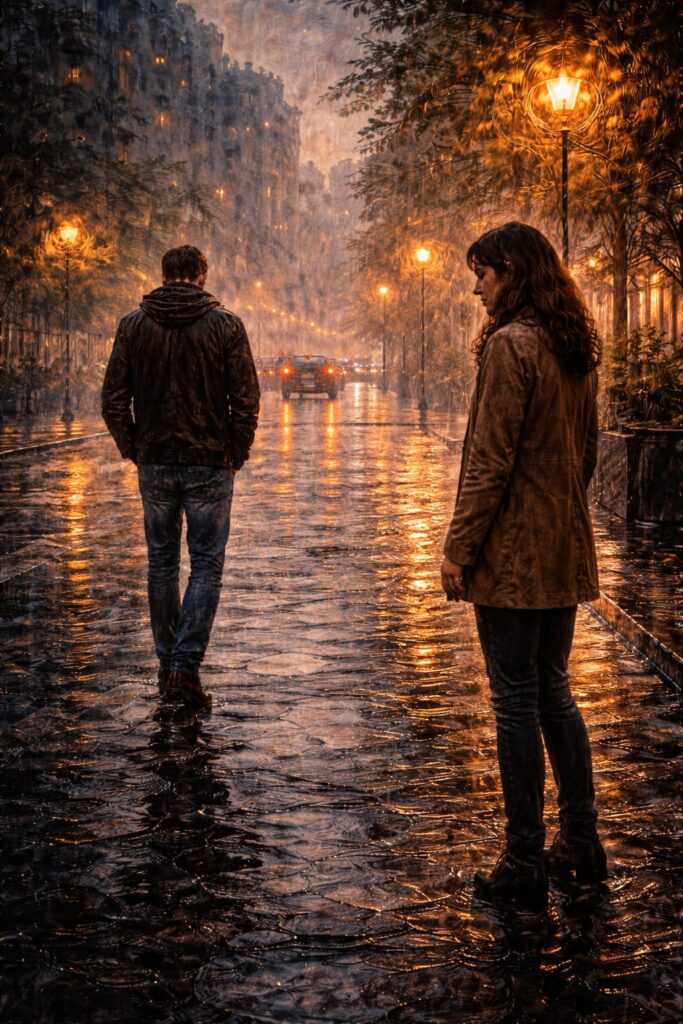 La pioggia e le ombre comprimono lo spazio emotivo. I protagonisti non condividono più lo stesso centro visivo. Uno si allontana, l’altra resta. La luce non unisce più ma isola. Il cambiamento cromatico rappresenta la tensione e il rischio di perdita. L’amore non è più promessa, ma possibilità di fine.