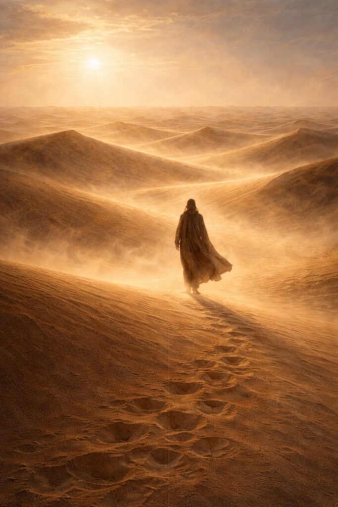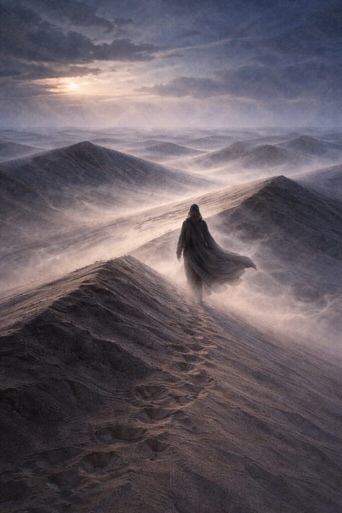 Nel primo atto la figura è ferma davanti all’immensità del deserto. La luce calda del tramonto crea una sensazione di contemplazione e solitudine. I colori sono morbidi e avvolgenti, suggerendo uno smarrimento silenzioso più che drammatico.