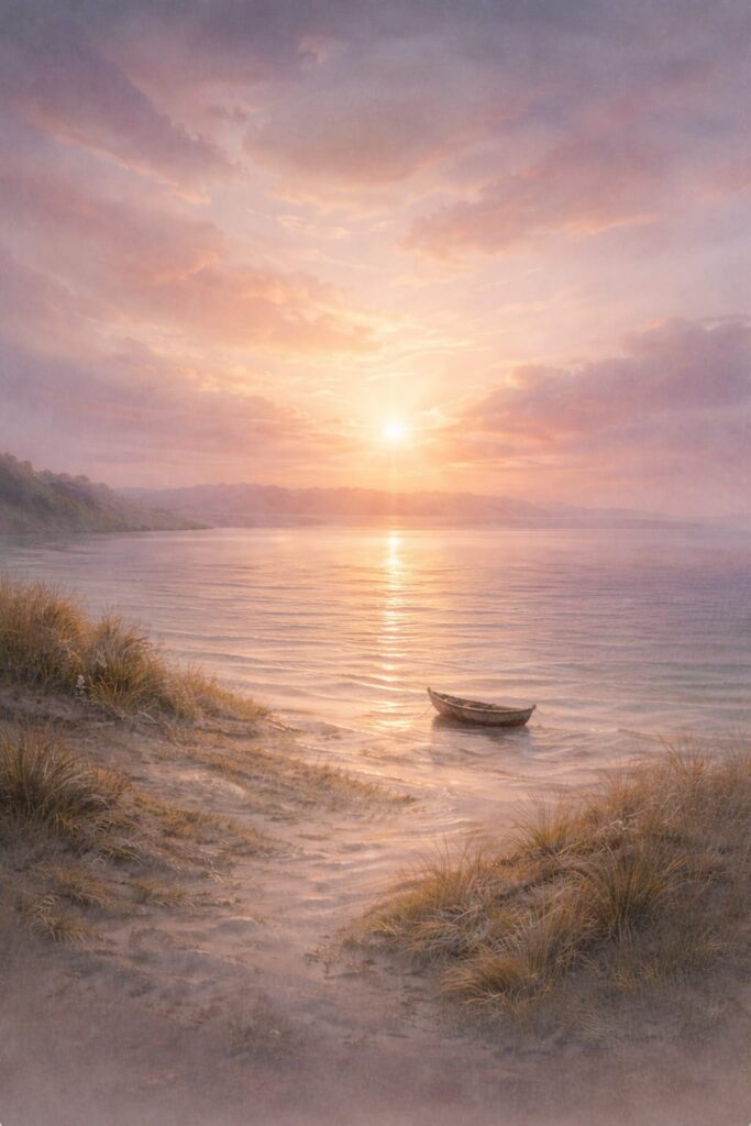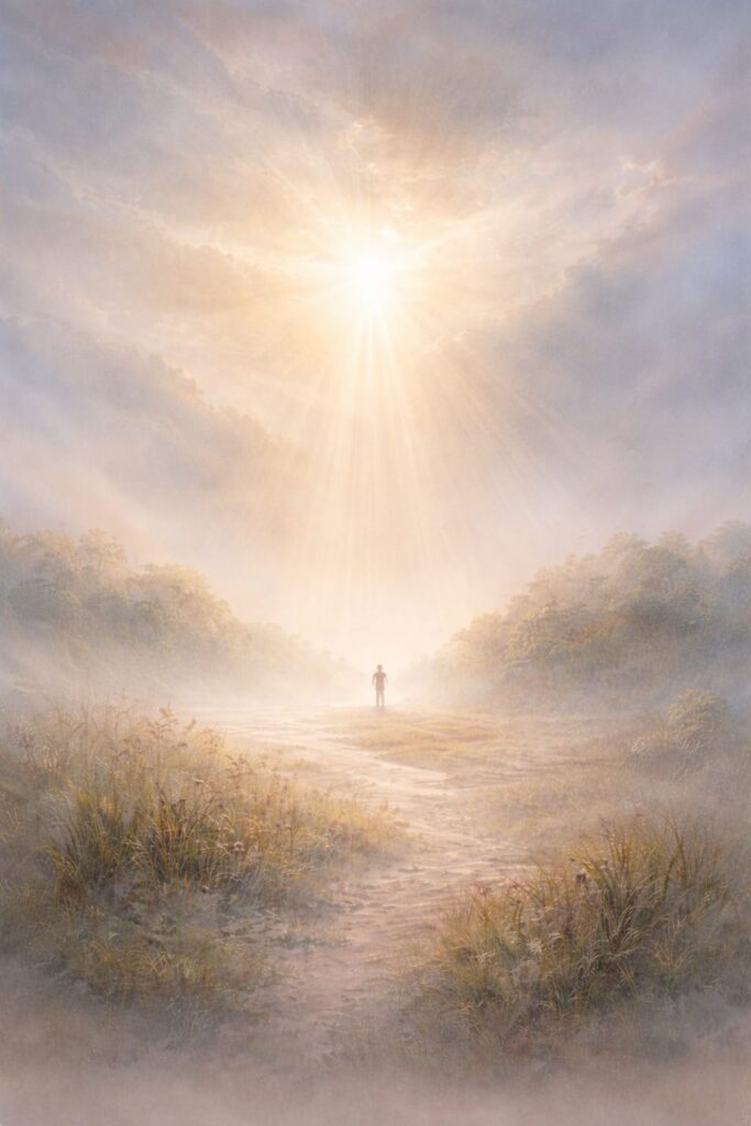 La luce non è più dominante dall’alto, ma diffusa all’orizzonte. Qui la speranza vive nel tempo dell’attesa, nella sospensione, in quella fase in cui non si sa ancora se la luce arriverà davvero